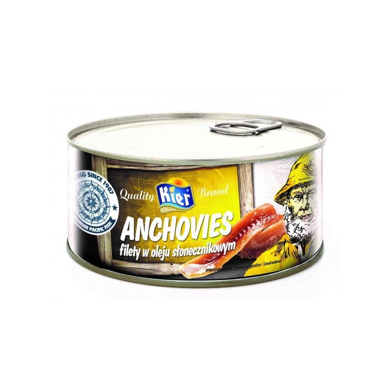 Anchois w oleju słonecznikowym marki Kier to gwarancja najwyższej jakości i oryginalności pochodzenia filetów sardeli z wód północno-zachodniego Atlantyku. Stanowi doskonałe wykończenie sałatek, sosów, past i pizzy.