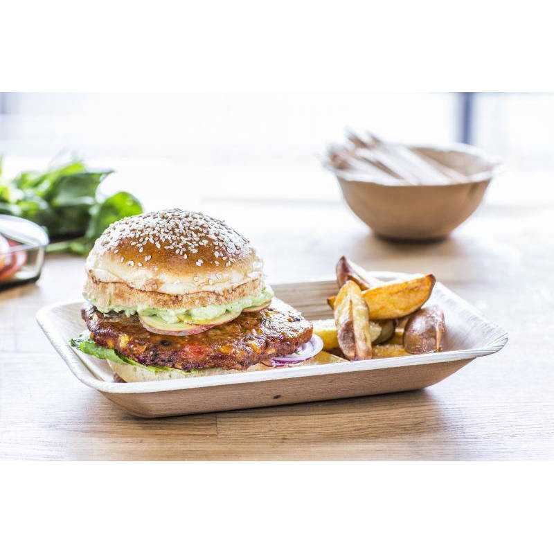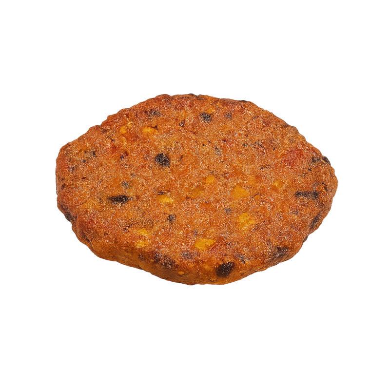 Burgery z komosą ryżową, czarną i czerwoną fasolą, kukurydzą cukrową, podsmażoną cebulą i czerwoną papryką, z lekką pomidorową nutą i ostrym chilli.