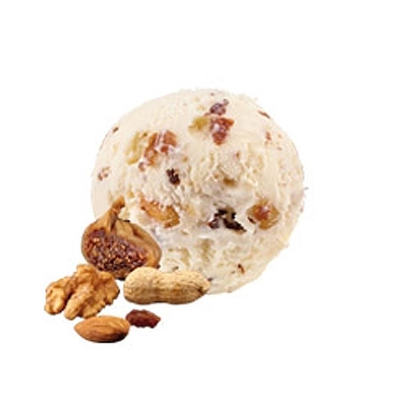 Bogactwo bakalii. Lody śmietankowe wzbogacone o kompozycję ręcznie siekanych orzechów włoskich, rodzynek, fig i orzechów arachidowych.